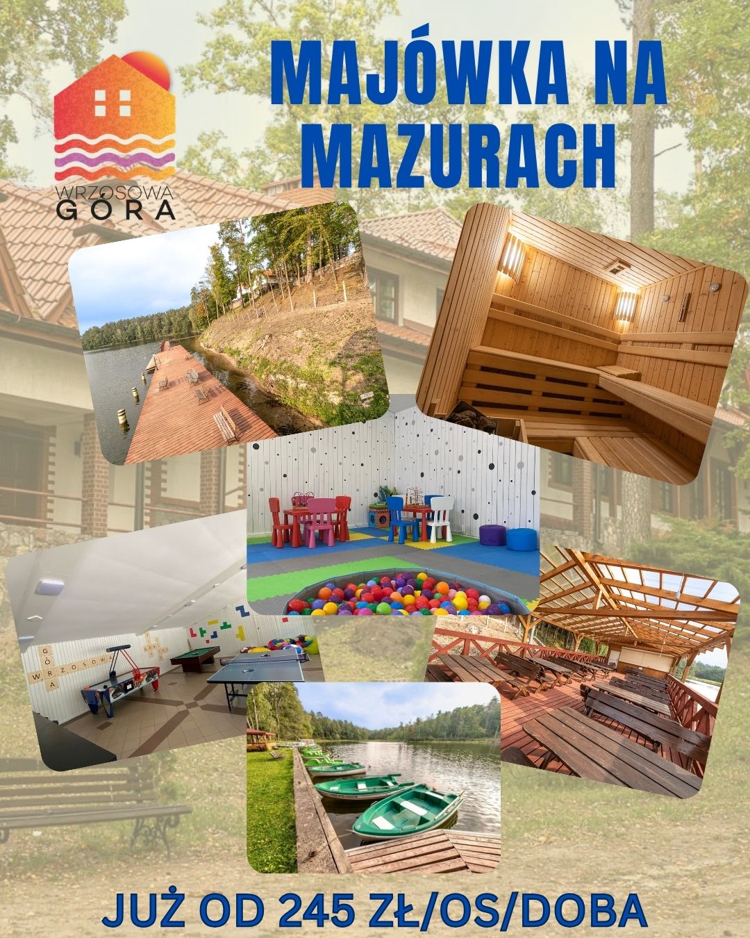 Warmia i Mazury to setki malowniczo położonych jezior połączonych systemem rzek i kanałów. To właśnie tutaj, w sercu Puszczy Piskiej, w gminie Ruciane-Nida nad jeziorem Guzianka, wśród pięknych stuletnich sosen, na wysokiej skarpie położony jest ośrodek Wrzosowa Góra. Ten liczący niemal 4 ha teren oferuje bezpośredni dostęp do jeziora i lasu, ciszę z dala od zgiełku miasta i wyjątkowy kontakt z przyrodą.